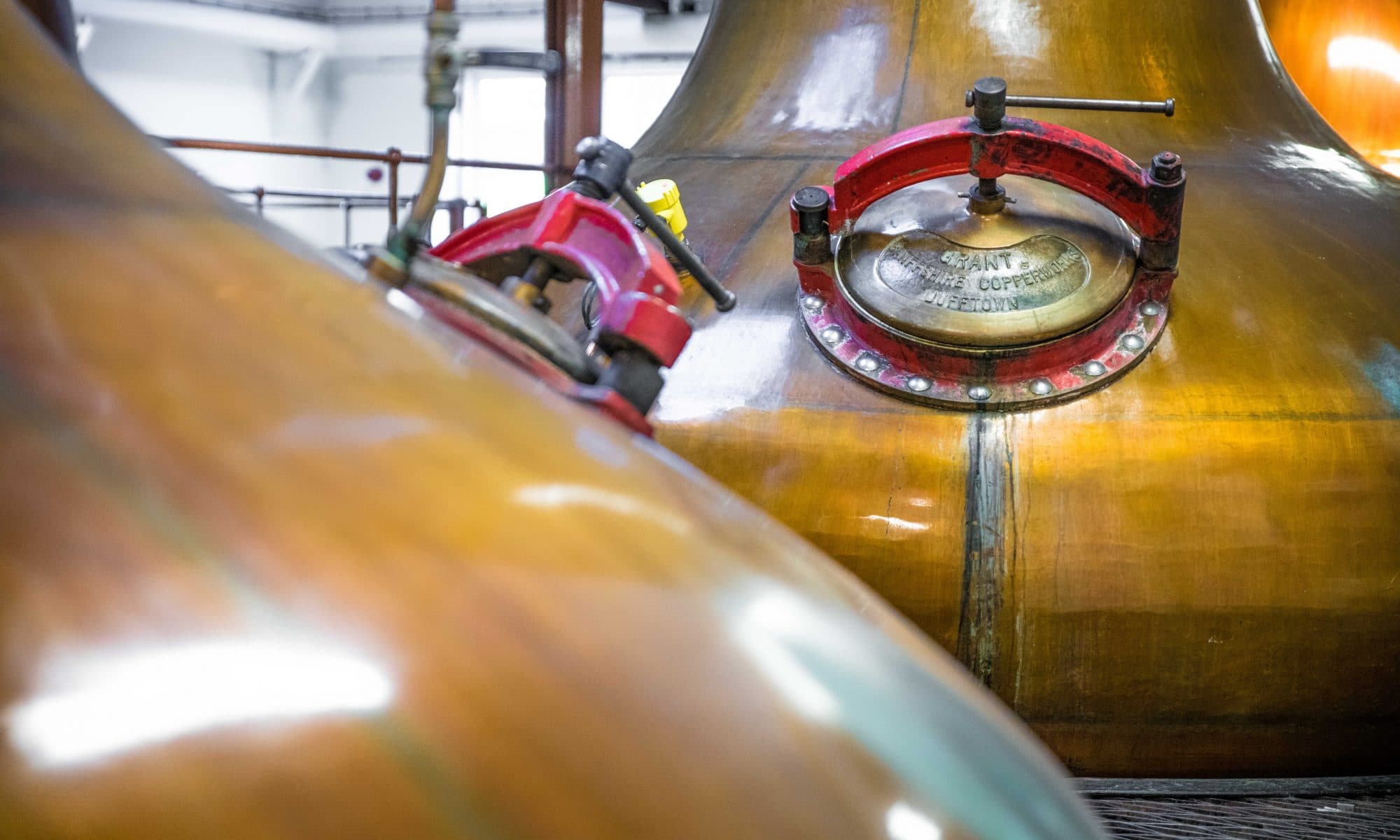 En Escocia, he podido comprobar que todas las destilerías de whisky están íntimamente ligadas a sus alambiques. Ellos son los que condicionan, en gran parte, el carácter del futuro whisky. La forma del alambique, la velocidad de destilación y el proceso de calentamiento: cada elemento es clave. El whisky escocés suele destilarse dos veces, según me han contado. El principio de la destilación es sencillo: aporta al whisky una intensidad que no sería posible obtener tras una mera fermentación de la cebada malteada. Los alambiques están fabricados en cobre y resultan inconfundibles por su bonito color dorado. Con la experiencia, los destiladores escoceses se han dado cuenta de que era el material ideal para conducir el calor y producir un néctar rico en aromas. En este alambique, podemos leer «Dufftown», en referencia al lugar donde fue fabricado. Dufftown es un pequeño pueblo de Escocia, en el corazón de Speyside. En esa región, rica en agua muy pura, encontramos la mayor parte de las destilerías escocesas.