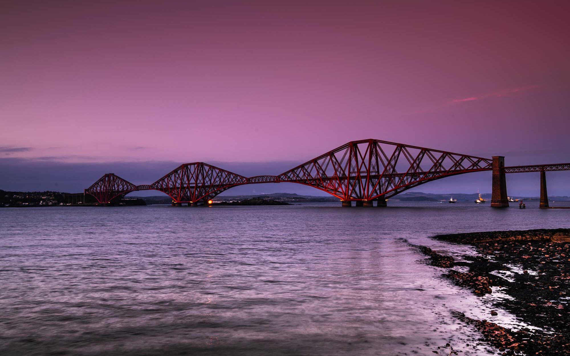 Forth Bridge es el puente que une Edimburgo con la región de Fife. Si toma el tren por el norte de Escocia, viajará por esta región. El puente tiene un aspecto muy moderno con sus arcos. Fue construido a finales del siglo XIX. En la época, sus 2,5 km de largo fueron una auténtica proeza técnica. Las obras de construcción duraron más de 8 años. Su estructura le confiere una gran solidez. ¡Y ya hace casi 130 años que está en pie! Los escoceses están muy apegados a este puente. Al anochecer, en Queensferry, les gusta pasear por la orilla y ver cómo va encendiéndose el cielo. Yo también he contemplado la puesta de sol desde aquí. Después, he ido a tomar una copa a uno de los numerosos pubs del barrio. ¡Ha sido una noche encantadora!