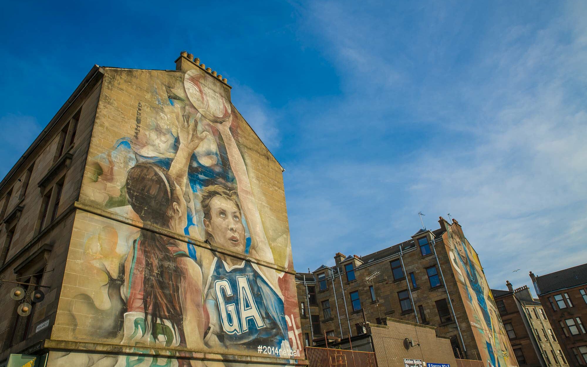 Glasgow es una auténtica fuente de inspiración para los artistas callejeros. ¡El Street Art está en todas partes! Caminando, he visto un cocodrilo, un músico e incluso el gigante escocés de la comedia Billy Connolly. Desde 2014, el ayuntamiento ha editado un mapa para encontrar todos los murales. ¡Un verdadero museo al aire libre! Estas pinturas me han sorprendido. Las he visto de camino a la estación Partick. En ellas se ven dos jugadoras de netball y más allá una jugadora de hockey. Estos murales se pintaron en 2014. Fueron creados por Guido Van Helten, con motivo de la celebración de los Juegos de la Commonwealth en Glasgow. Me gustan estas pinturas. Dan vida a estas paredes de piedra y cuentan la historia de la gente de Glasgow.