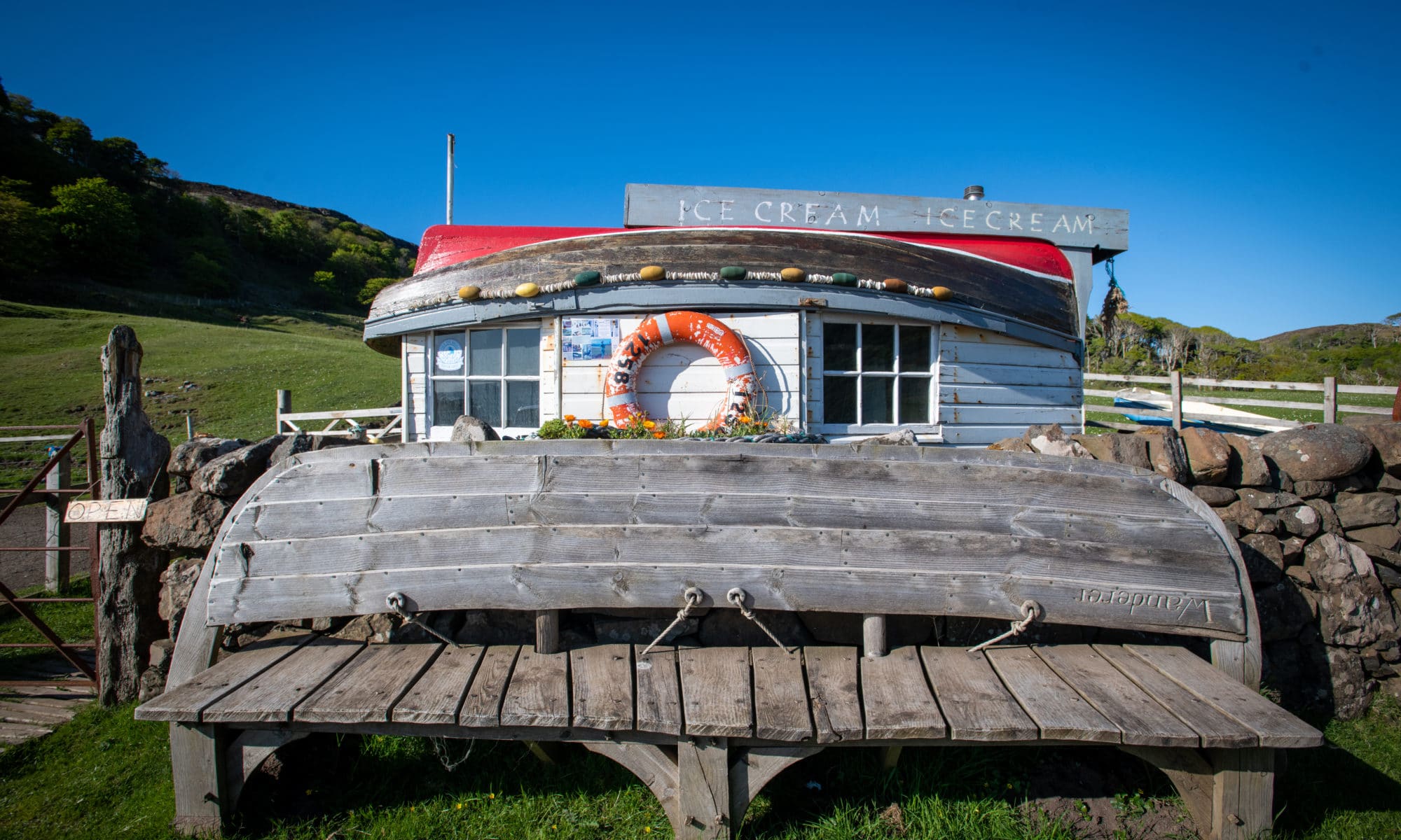 En general, la gente asocia el helado con un cálido día de verano. Sin embargo, en Escocia, basta un simple rayo de sol para despertar en nosotros el deseo de un delicioso cono de helado. Además, en la isla de Mull, se elaboran unos helados excelentes. Elaborado con la leche que se produce en la isla, el «Ice Cream» de Mull es conocido por su untuosidad. Así que, aquí sentado en esta barca reconvertida en banco, frente a la increíble bahía de Calgary, es casi obligatorio tomarse un helado. Con el cálido sol en el rostro y la mirada puesta en la playa de Calgary, está tan rico que creo que voy a repetir.