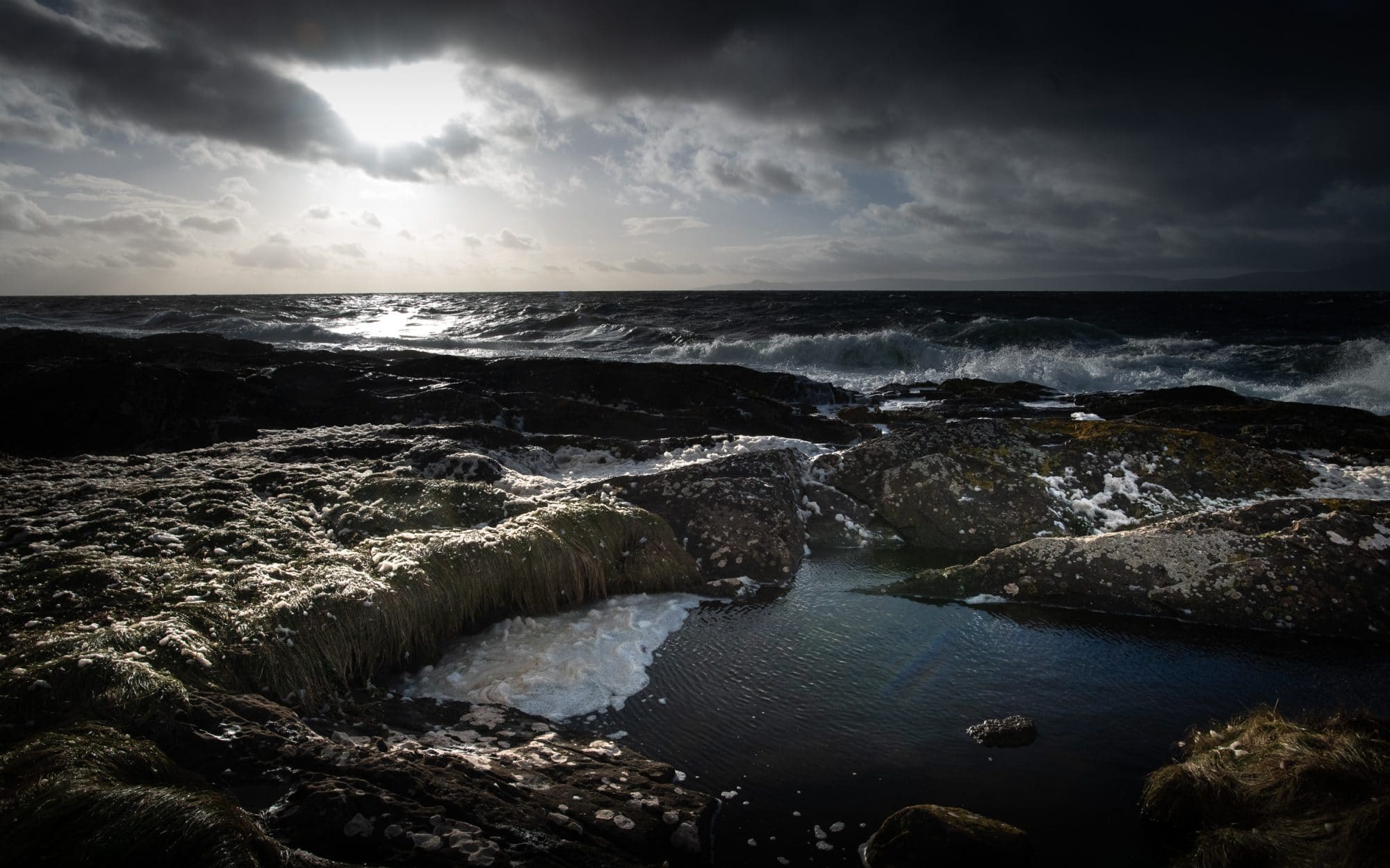 Portencross is a charming port village. Around it, the coast alternates between small beaches and rocky bars. On the rocks, the waves crash with regularity. As the water comes and goes, I can see a carpet of white foam forming. Suddenly, a gust of wind makes the foam fly. It looks like a « foam party » in the middle of the day! I had never been to this kind of party outside of a nightclub. In front of such a landscape, it is a real success!