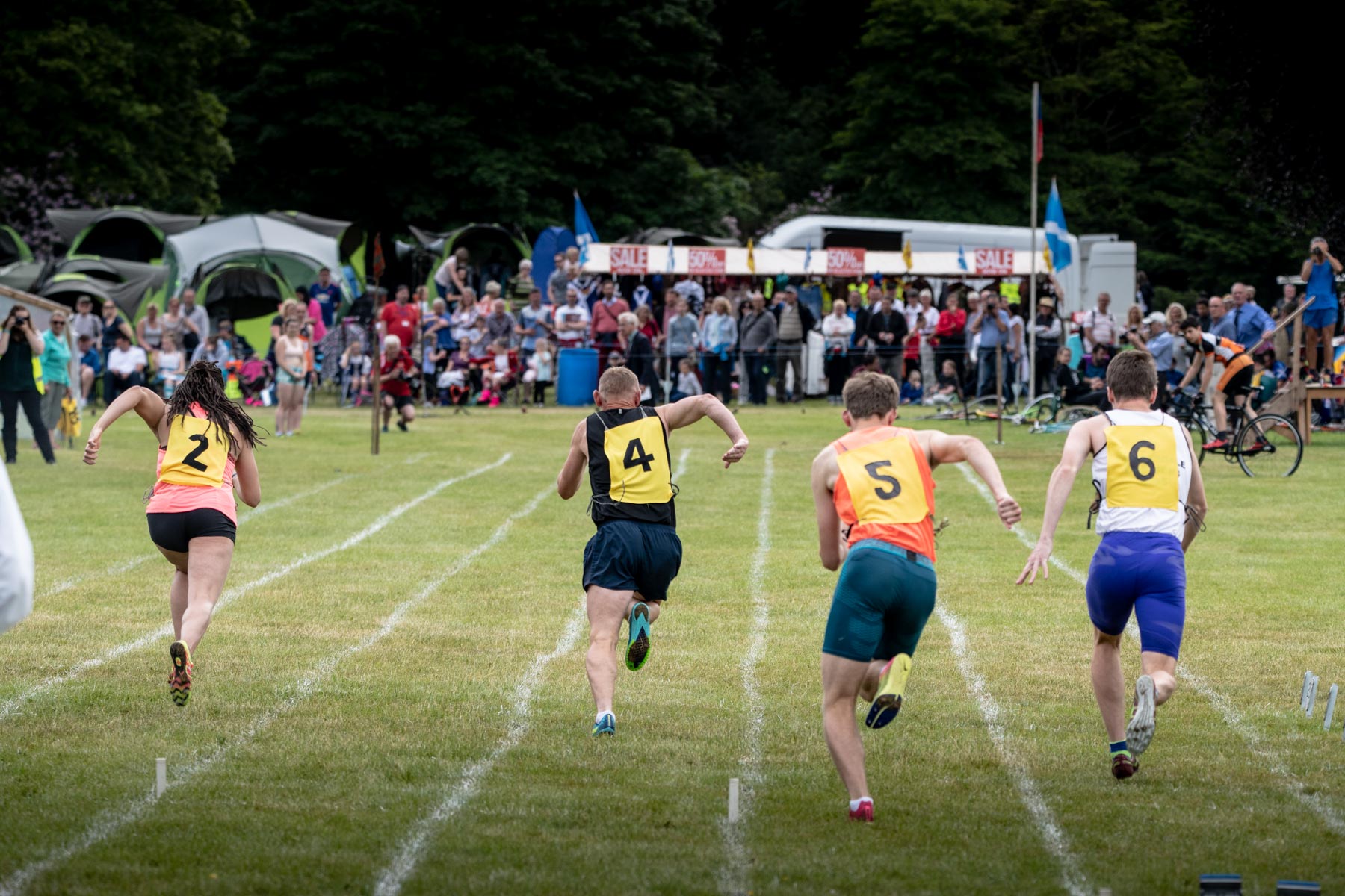 When I discuss the Highland Games with friends, they often tell me about tug-of-war or trunk throwing. They’re part of these games’ events, but there are many more! Running is a classic. At Strathmore Highland Games, the athletes compete on 90, 200, 800 or even 3200 metres. There are also relay races. Before starting, the runners arrive a long time in advance. For long minutes, I saw them stretch and especially warm up their ankles. The race takes place on turf that is perfectly trimmed, but less stable than an athletic track. Despite the mandatory spike shoes, it is also more difficult to find support. Each runner is there to surpass themself, under the watchful eye of an audience of connoisseurs. I was part of them!