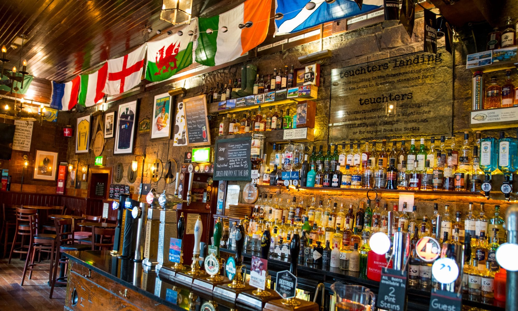 « Teuchter » refers to a rude and rustic Highland man. It’s a scornful word. So why call the pub that way? The two founders, themselves « teuchters », decided to see the funny side of the expression. That’s what they explain in the pub.